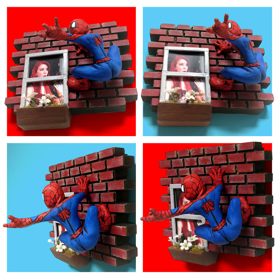 I made this out of MDF, (A type of wood.) Popsicle sticks, wire, tinfoil, Sculpy and some other stuff. The hardest part was drawing those @#$%ing webs on his costume. I did that with a Sharpie after I painted it. I had this idea to integrate a photo into it, so I had a facebook contest to find a picture. I didn't get many entries, but I got good ones. The Lovely Laurie provided some Asian flavor. Fun Fact about her, she knows how to Hula dance. She's also a graphic artist and a high priced painter. Hot Hot Holly added her flair. Holly and I used to be cheerleaders in high school. I've picked her up over my head. (She's very lightweight.)